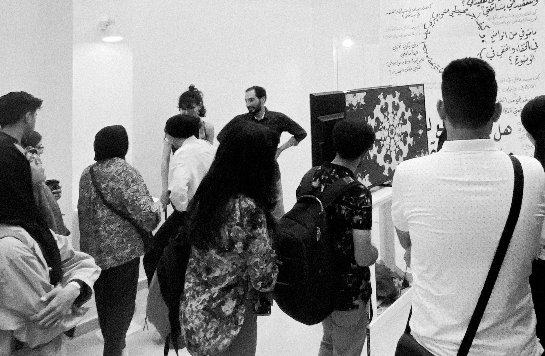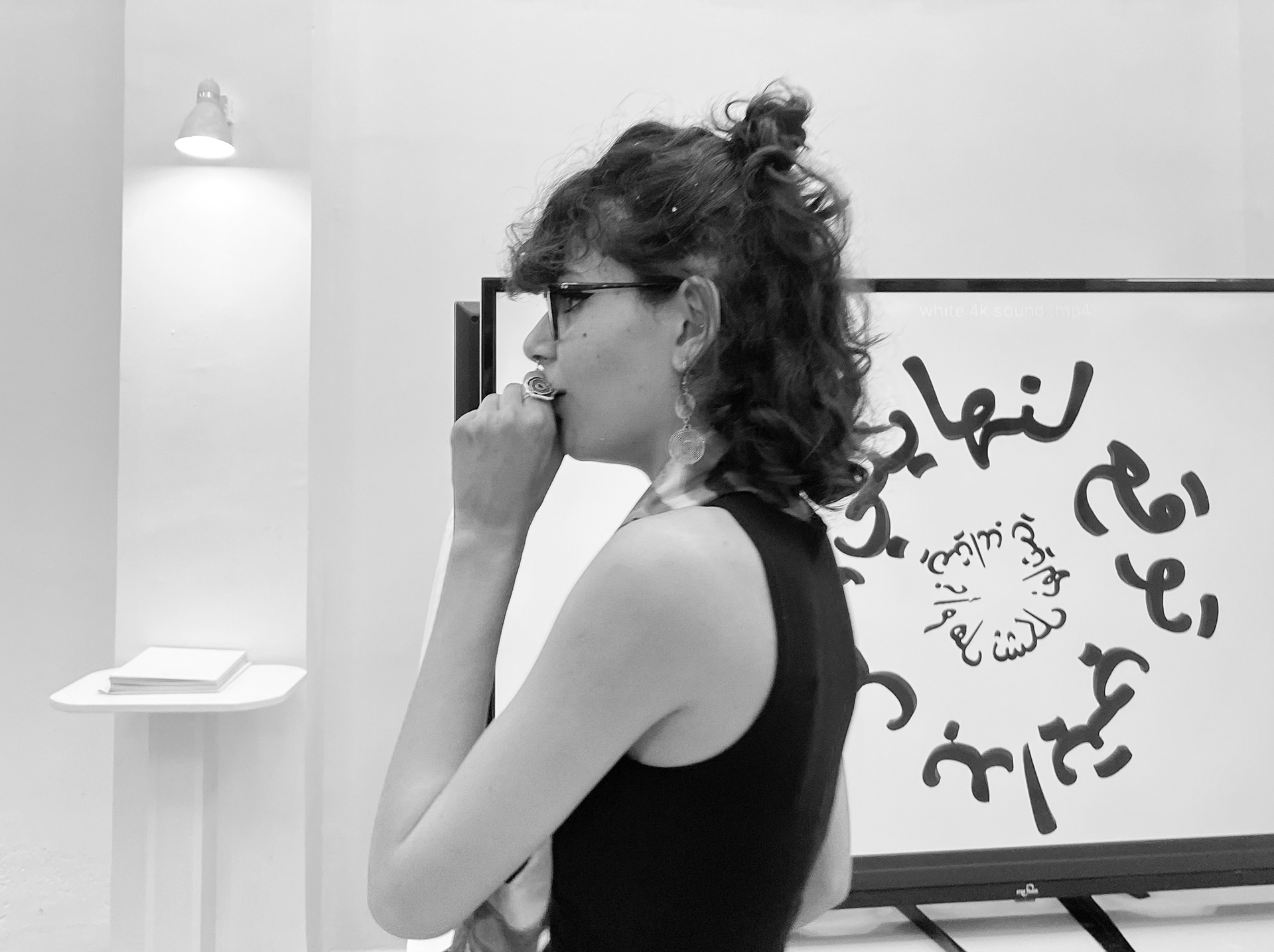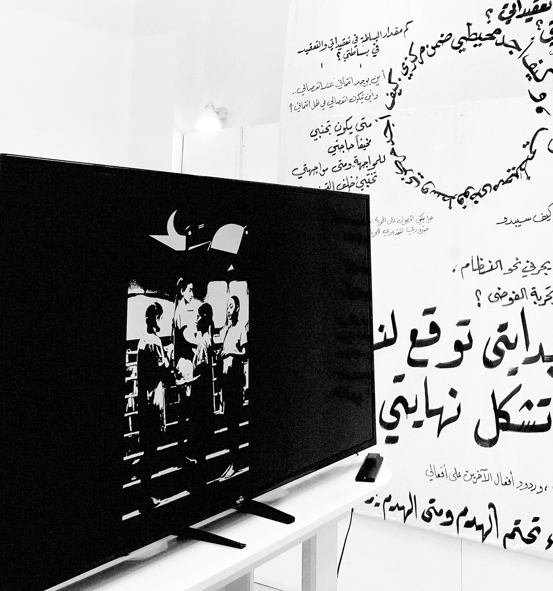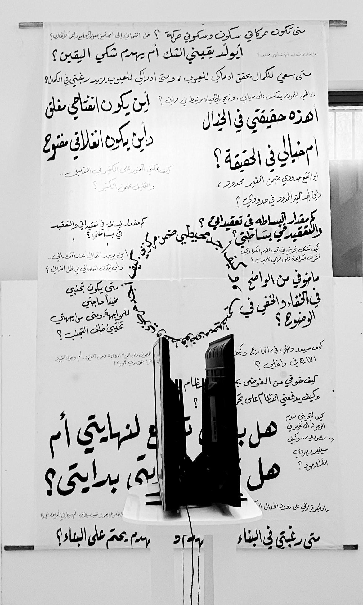 Every part of the work raises a question, and the answers to these questions become clear as the work goes on. The video installation was designed to make people turn around it to see what the other video hides. At the start of these two videos, the first thing viewers are questioned is: