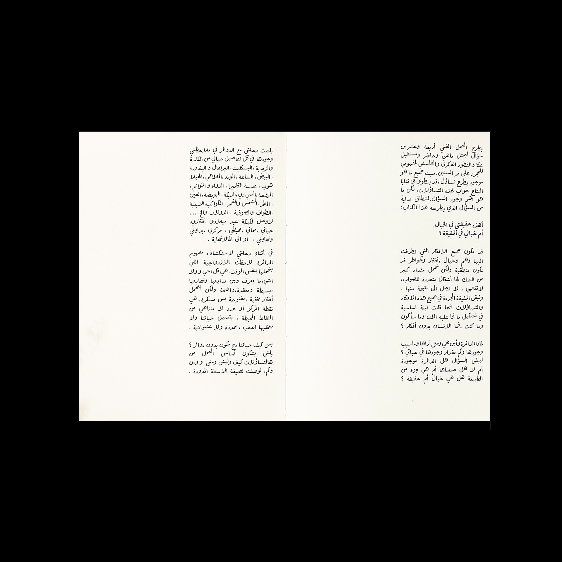 This question leads to more questions about where the beginning and end are, forming a spinning cloud of circular questions. This leads to the full book of scenes printed from what was seen in the videos (Discusses 20 questions of the artwork ), as well as lettering experiments and my investigation in discovering my circles, in a total of 21 questions of the artwork.