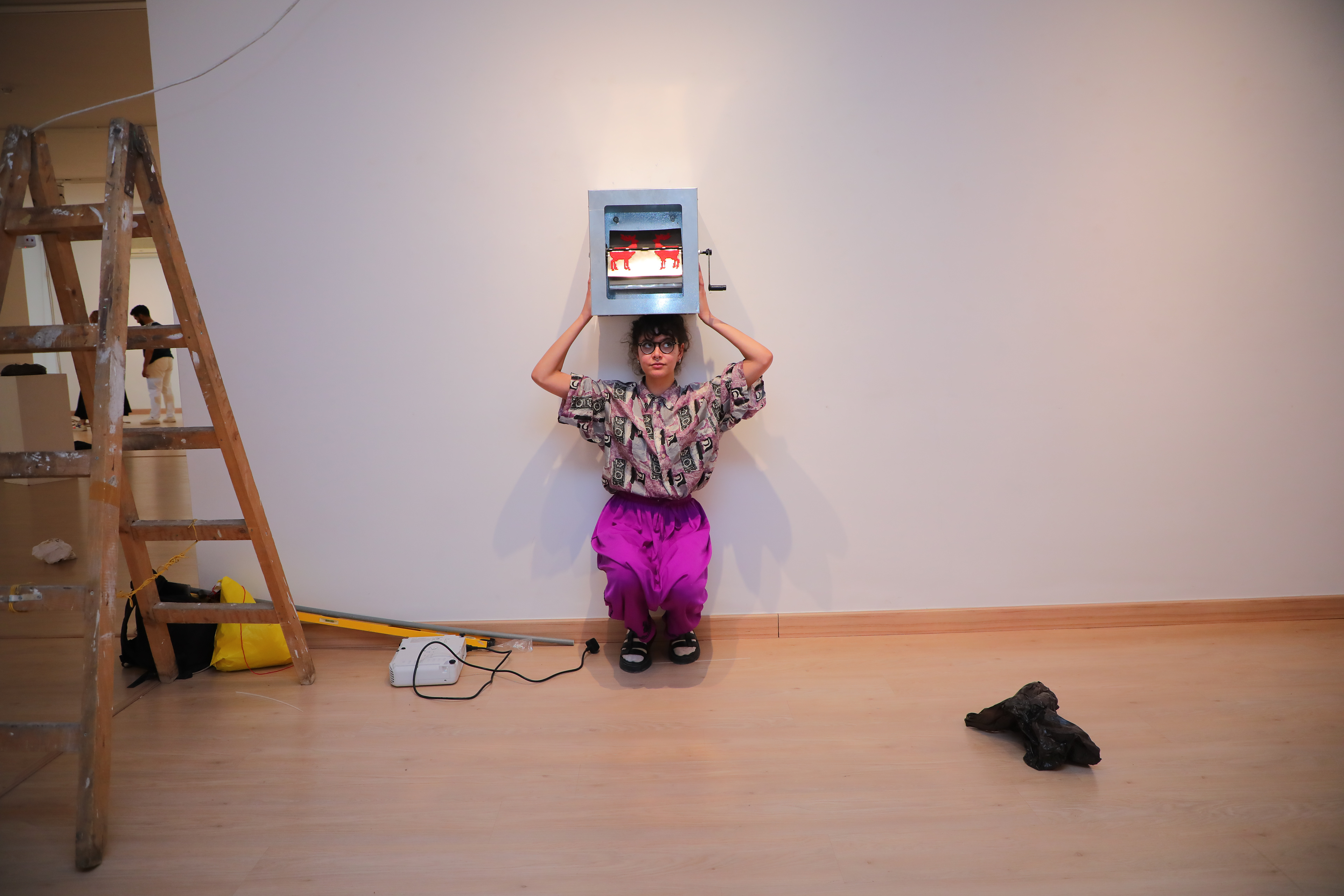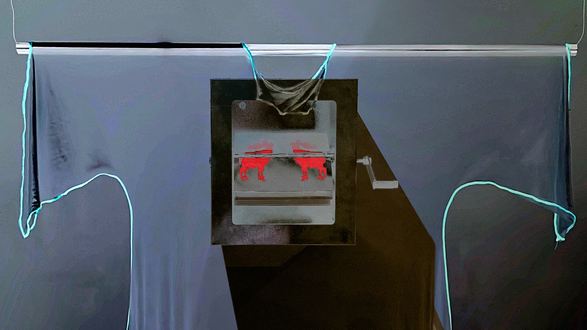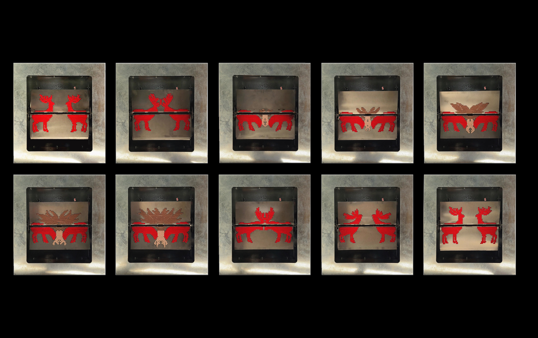 "Third Time’s a Charm" installation consists of a metal flip book with cross-stitch embroidered animation. Akka portrays two deer in a state between awakening and lamenting, attempting to revive the land. The leaves of the tree are composed of their own bodies, resembling roots that scream to be alive.