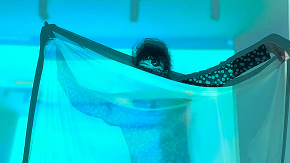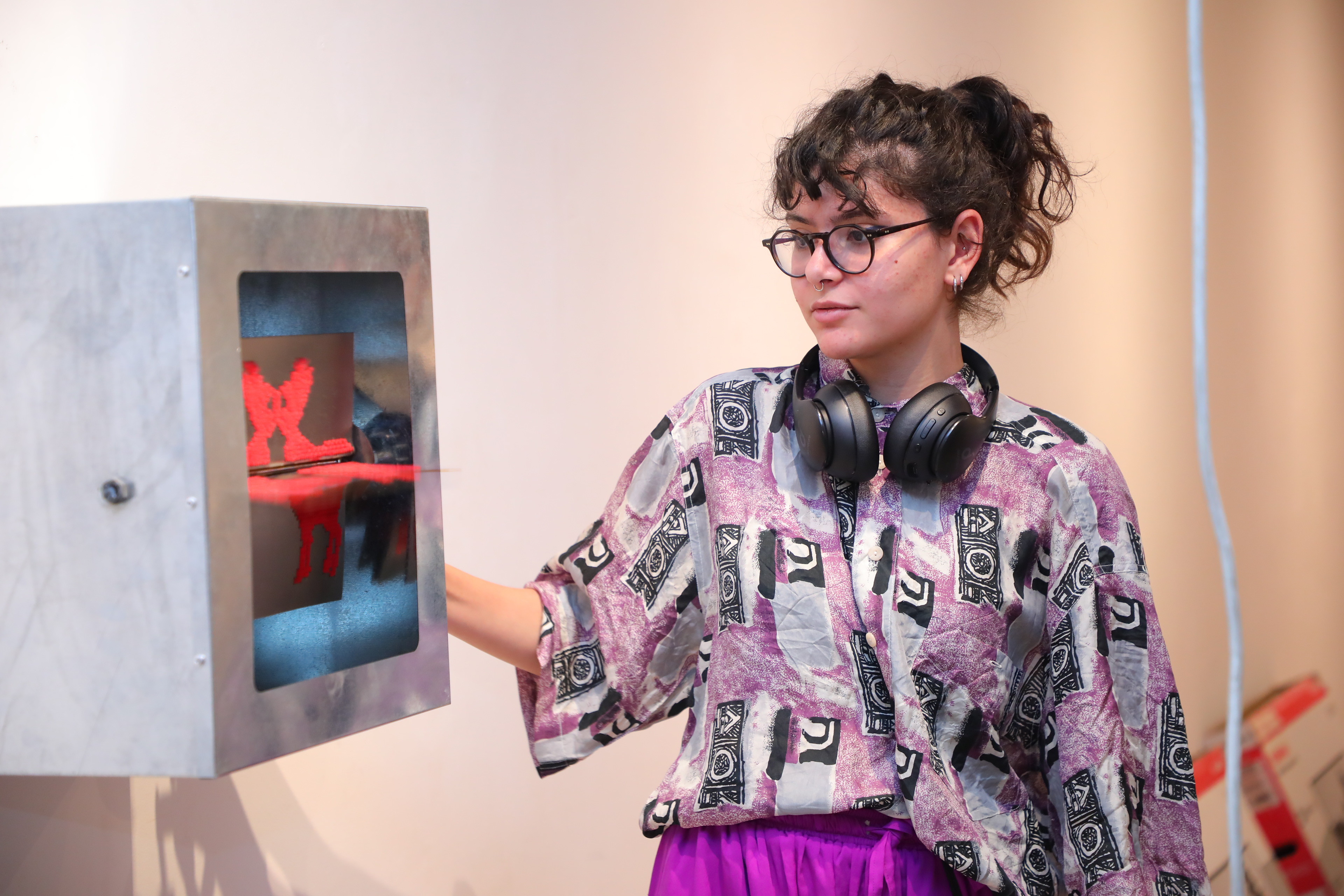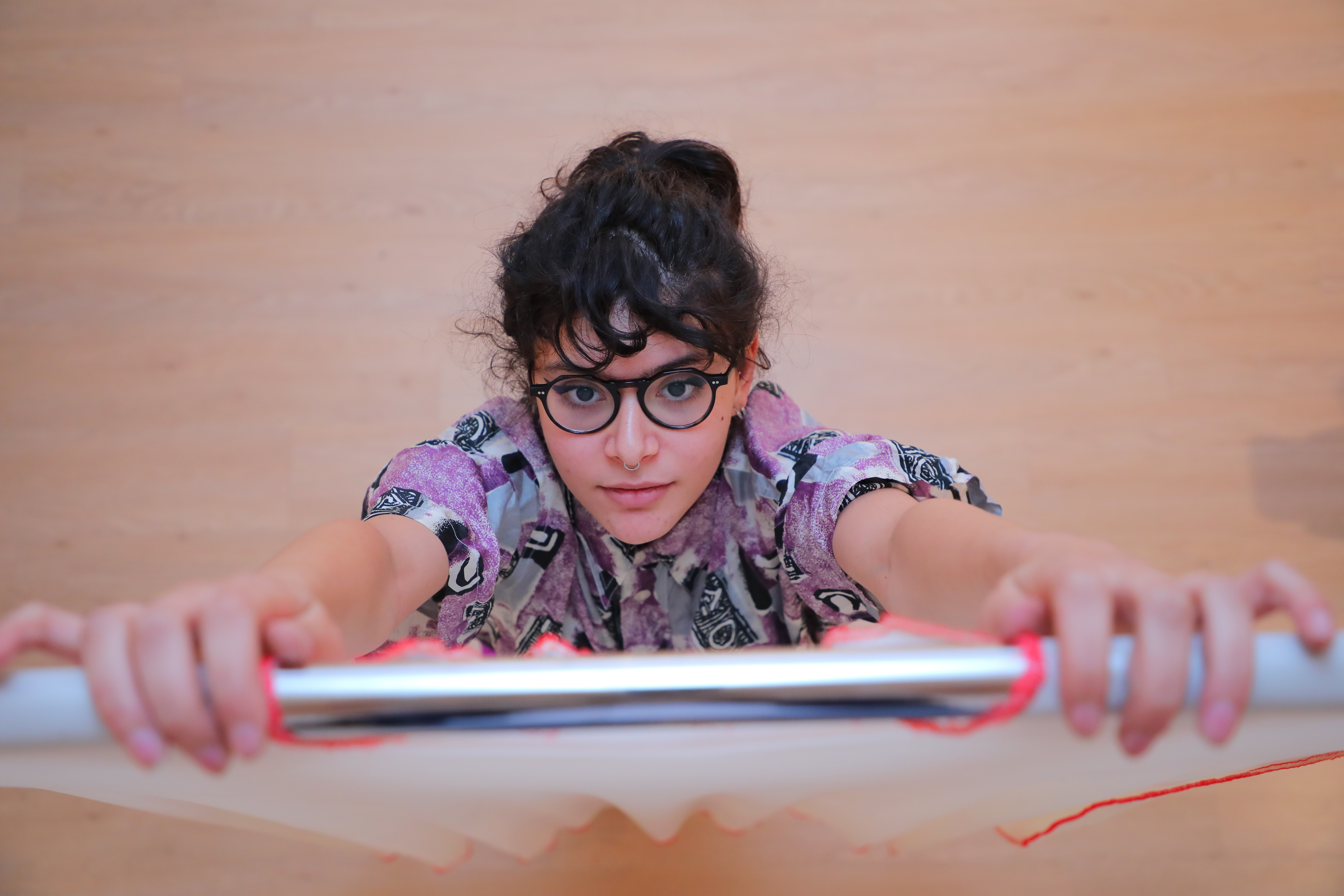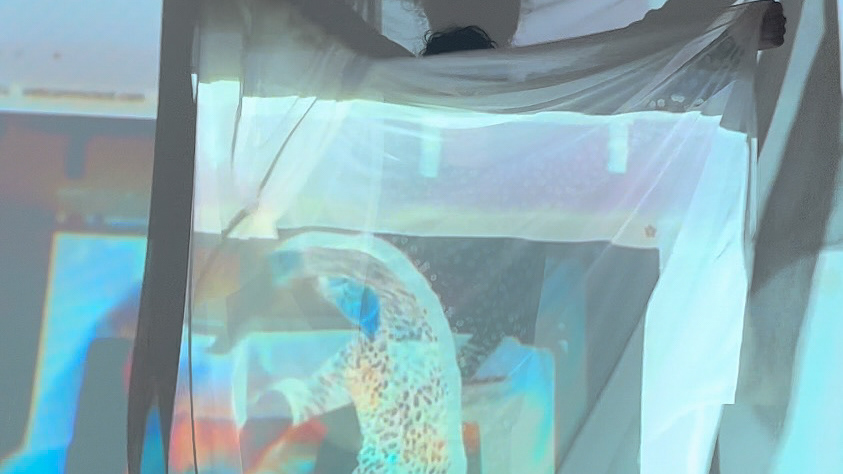 « and the fourth one's hitching a ride.» consist of a visual feedback system that captures body movements, seamlessly integrating live reflections into the fabric of the thobe, which are projected in real-time.